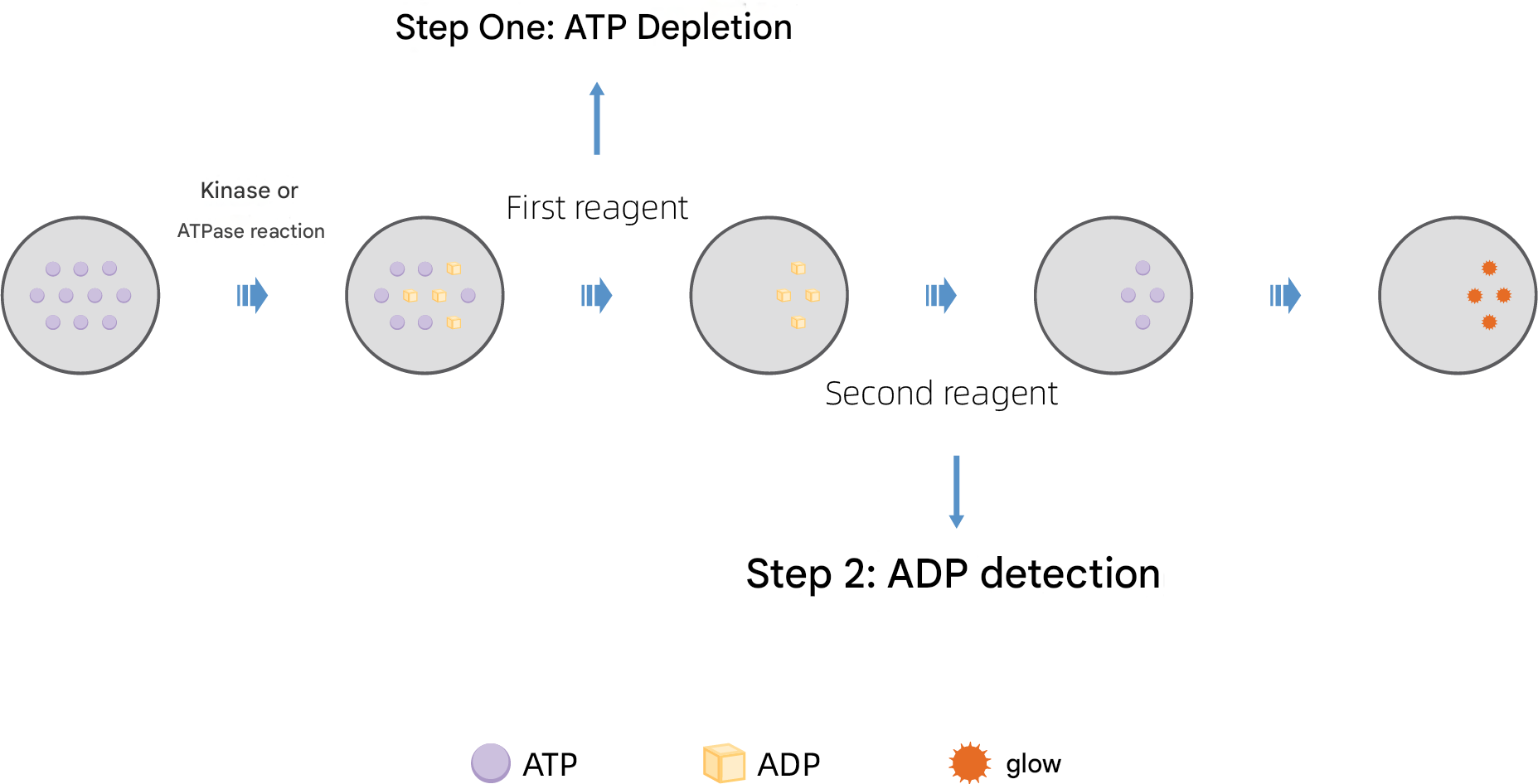 Second, the Second reagent is added to simultaneously convert ADP to ATP and