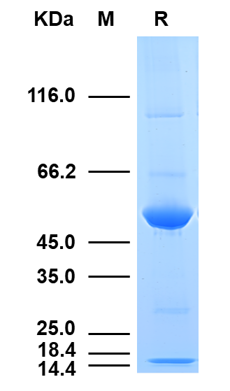 The theoretical molecular weight is 13.8 kDa and 59.2 kDa. Due to glycosylation, the molecular weight of SDS-PAGE reduction electrophoresis is 17 kDa and 65-70 kDa.