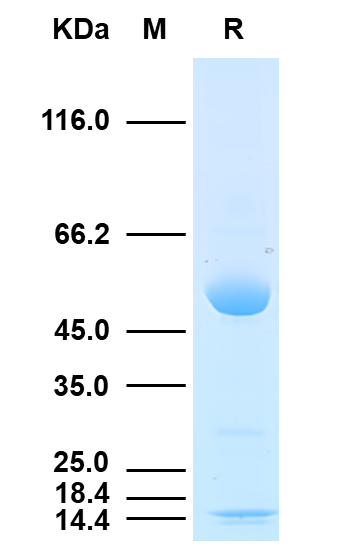The theoretical molecular weight is 13.9 kDa and 59.3 kDa. Due to glycosylation, the molecular weight of SDS-PAGE reduction electrophoresis is 17 kDa and 65 kDa.